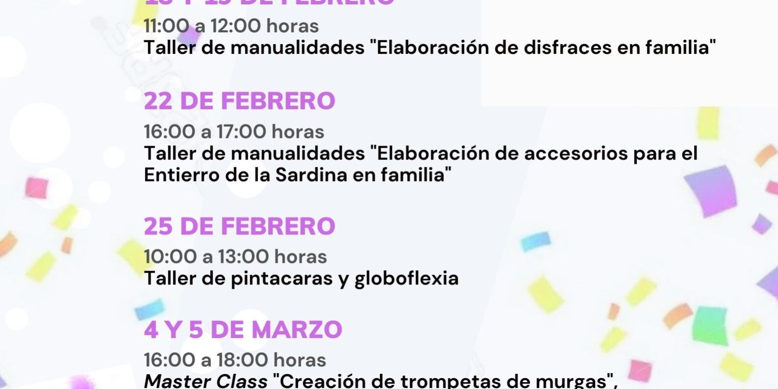 “Las actividades giran en torno a la confección de disfraces y accesorios de Carnaval, estarán dirigidas por monitores cualificados y requieren de la supervisión de los padres o tutores legales de los menores asistentes”, comentó Cabello, y especificó que “los talleres están pensados para un público familiar y la edad mínima de participación se ha establecido en cinco años, aunque en algunos casos, como los talleres sobre creación de trompetas o accesorios para el Entierro de la Sardina, también se contempla la participación de adultos”.
