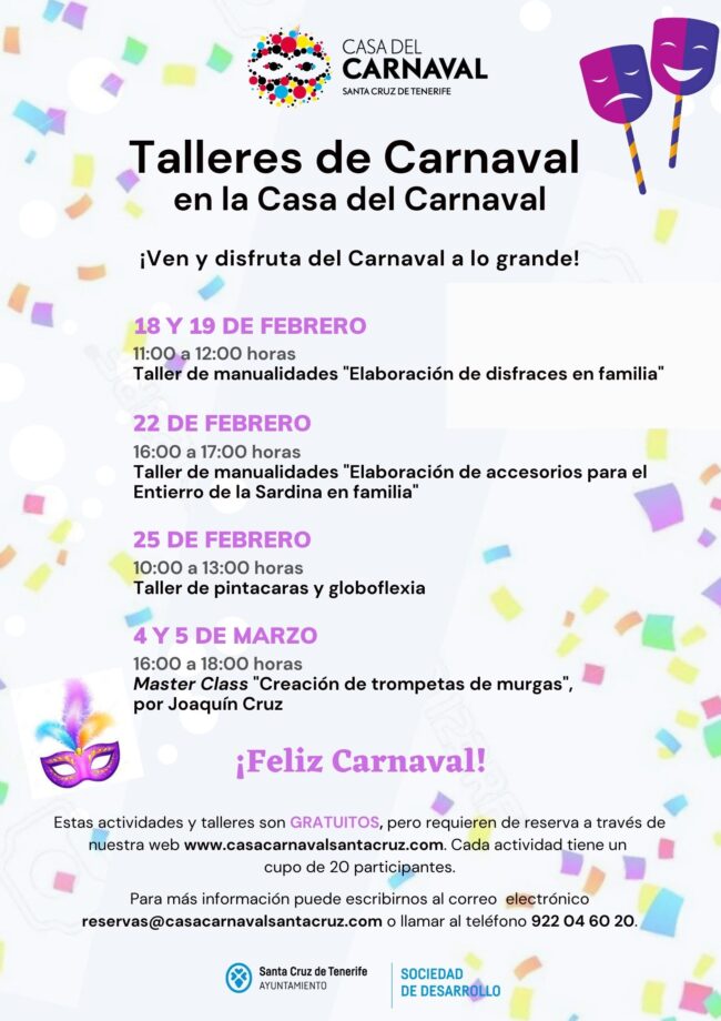 Las actividades, del 18 de febrero al 5 de marzo y están pensadas para un público familiar, centrándose en la elaboración de accesorios de Carnaval. Calendario completo en este enlace La Casa del Carnaval ha abierto las inscripciones para los talleres organizados con motivo del Carnaval de Santa Cruz, que comenzarán el próximo sábado, 18…